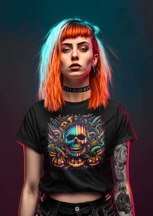 "American Skull Halloween Time" Unisex Full Color Graphic Tee | by AmericaShirt™